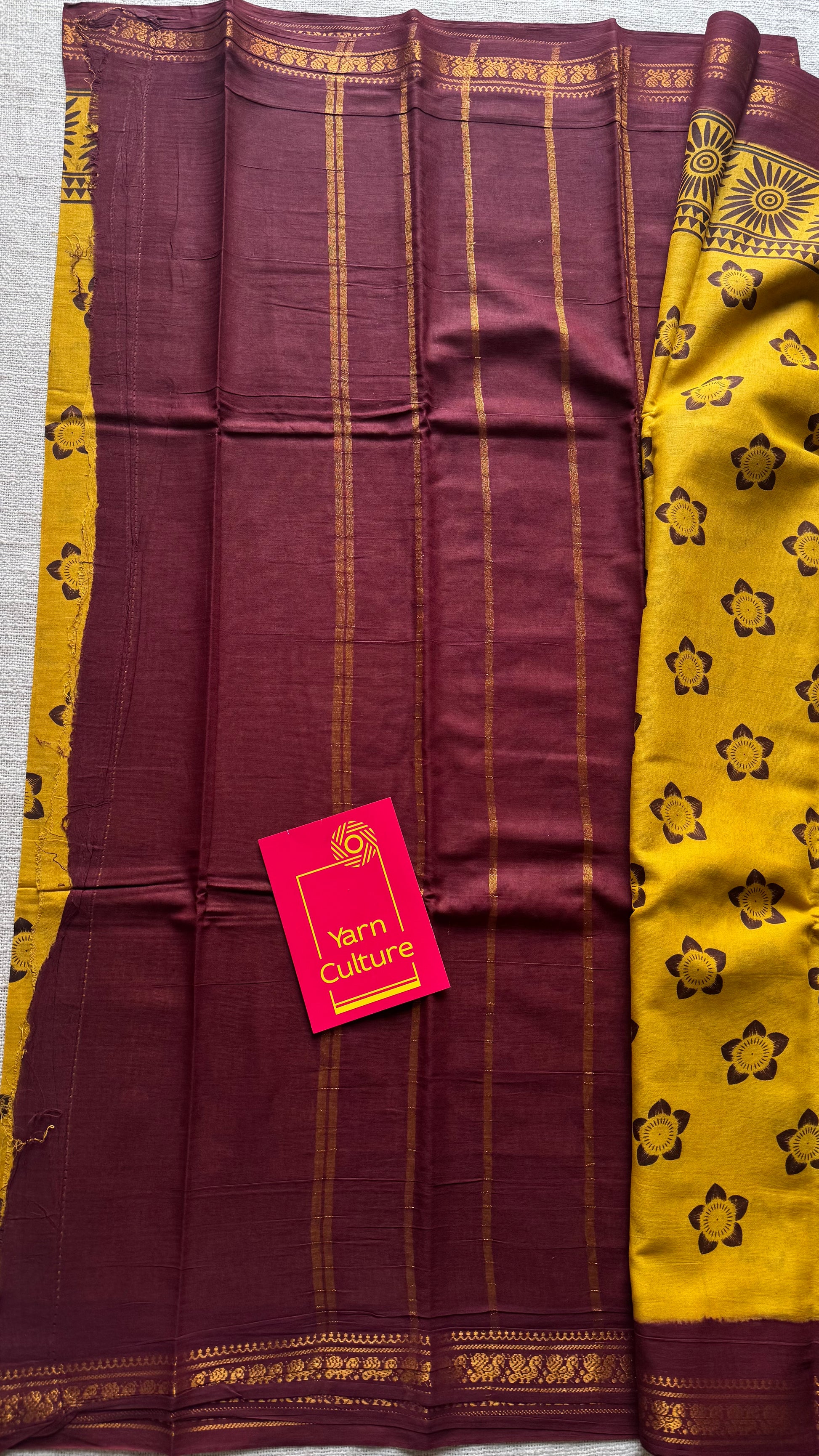 Yellow with maroon, motif printed, kattuchayam dyed madurai sungudi cotton saree - YCCOTNMSFE74