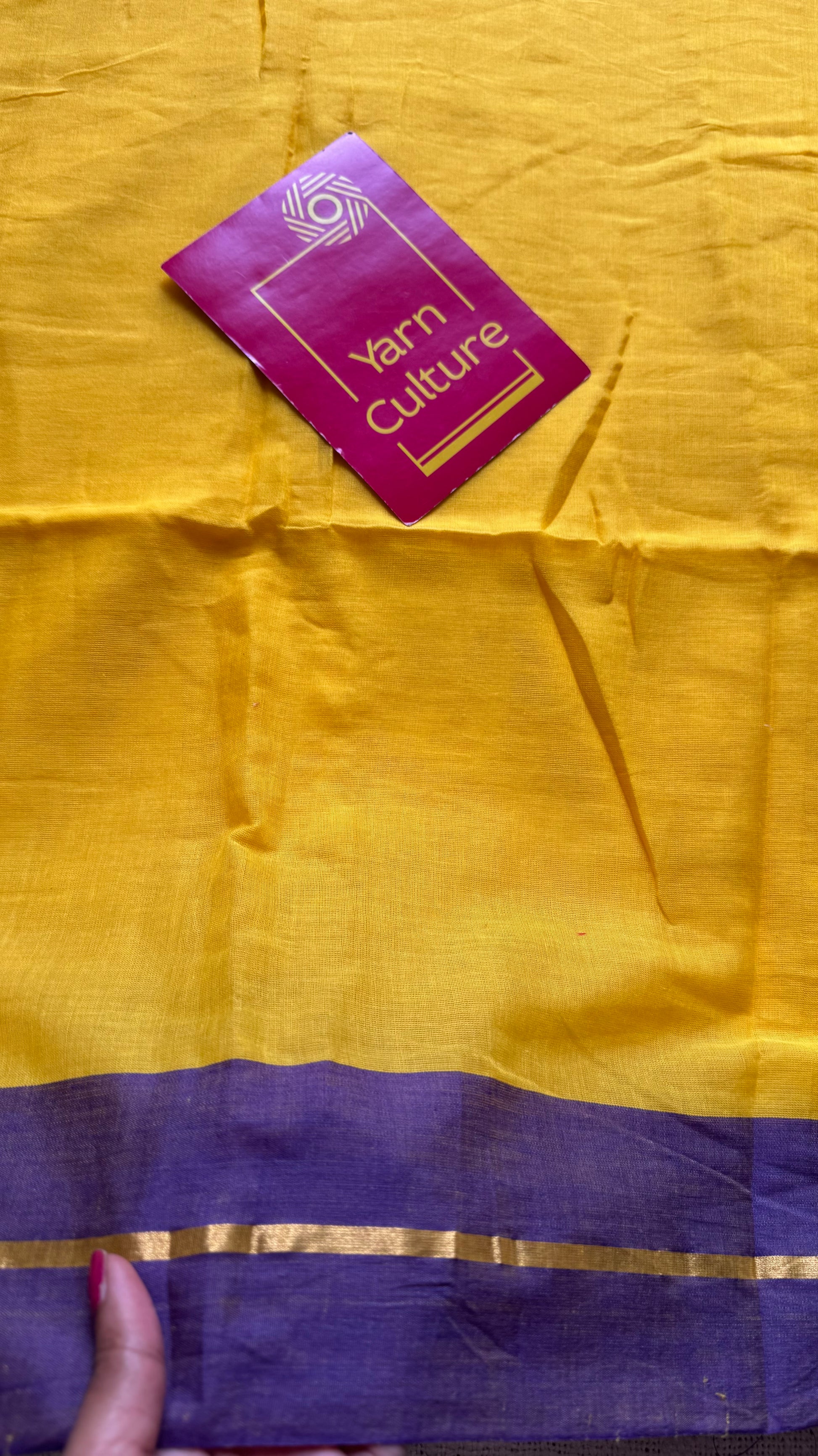 Everybody's favourite mul cotton in yellow with purple border, with thin antique gold zari gap border and with tassels.