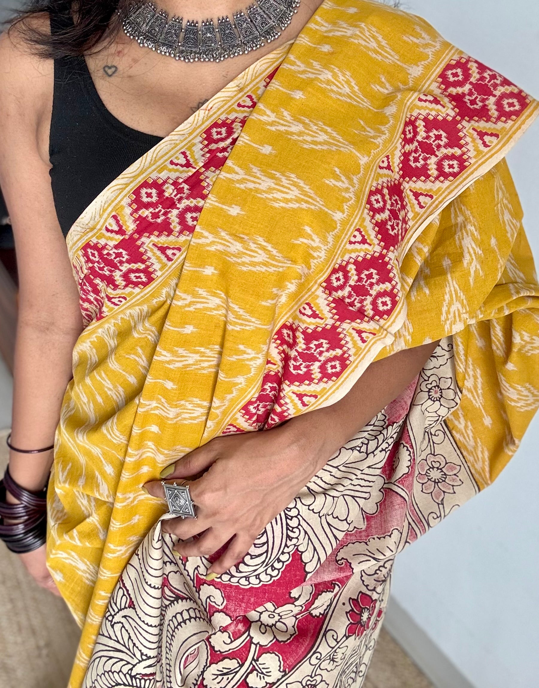 Yellow with red kalamkari, ikat motifs, soft cotton. Comes with running blouse in a contrast colour.